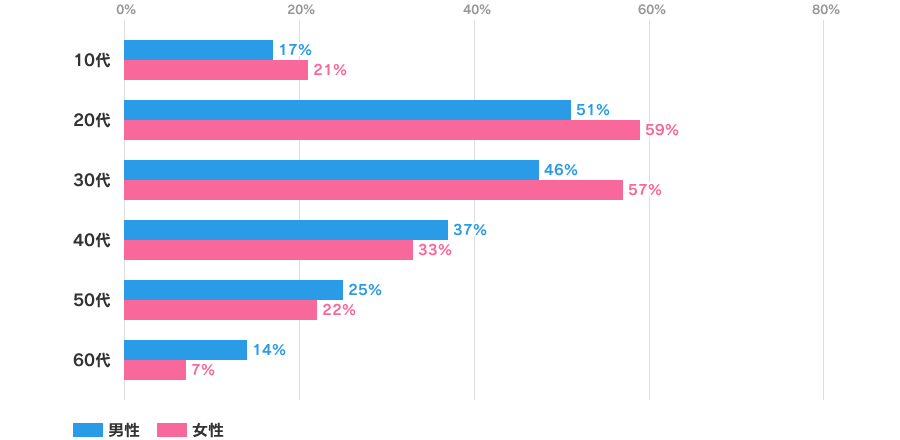 20代~40代が主な利用者層です。ビジネスマンや経営者の利用も多い傾向にあります。匿名性のSNSと比較すると、学生時代の友達や会社の同僚・先輩後輩など、リアルな繋がりが多くフォーマルな場として扱われています。TwitterやInstagramと比べて10代の利用割合は低く、30代前後の購買力のあるユーザーが多い傾向にあります。