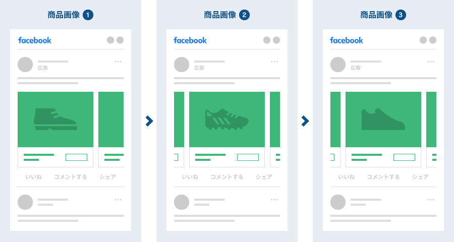 商品ごとに写真・説明文・リンク先URLを設定できる為、ユーザーが気に入った商品の詳細ページへダイレクトに誘導することができます。1回の広告表示で、1枚の画像よりも多くの情報を伝えることができます。