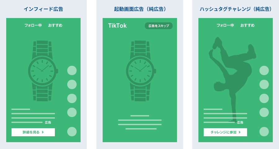 TikTokアプリを起動した際に、ファーストビューに必ず表示される純広告です。1日1社限定で独占的に掲載できる為、TikTokのアクティブユーザーに大量にリーチすることができます。インフィード広告と同様に、広告リンク先のURLを設定することができるので、認知拡大の他、商品購入を促すことも可能となっています。