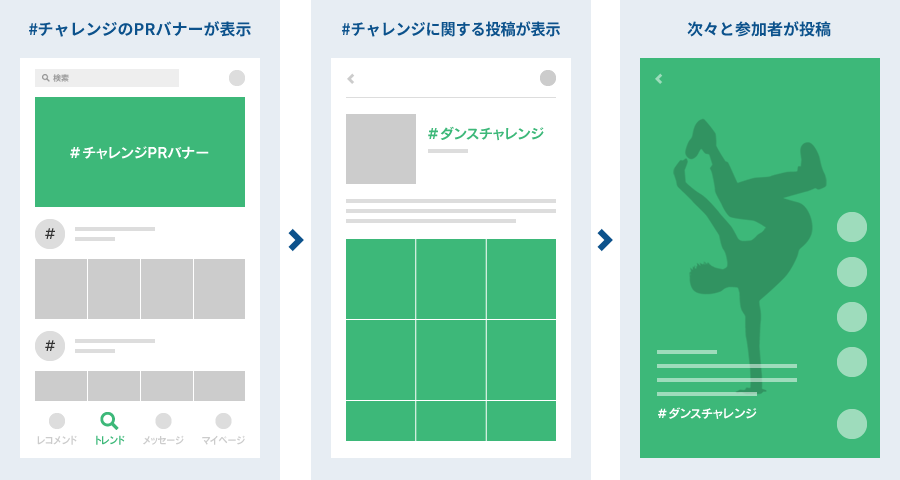 TikTokの起動画面や発見ページに#チャレンジを開催中であることをPRし、動画投稿へと繋げます。