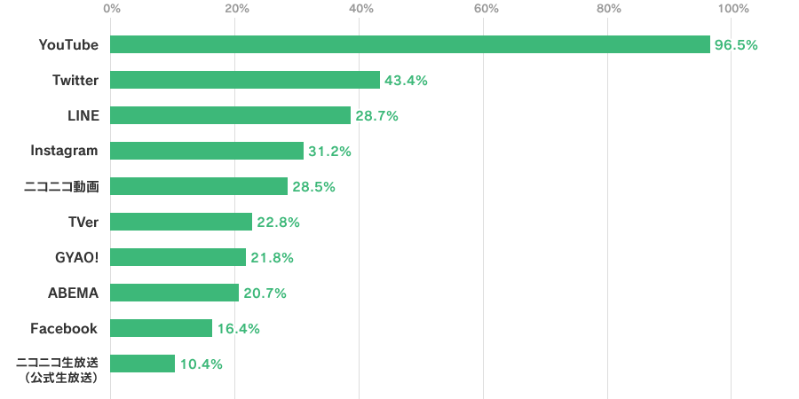 動画共有サービスの中で、日本で最も利用者が多いのがYouTubeです。年齢層や男女比においても、他SNSと比べて偏りが少なく、幅広いユーザー層を持っていることが見て取れます。