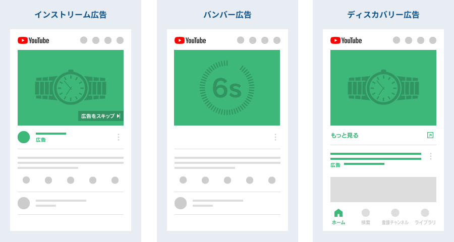 関連動画やYouTube検索結果画面の間に、広告動画のサムネイルを掲載できるメニューです。ユーザーが広告動画のサムネイルをクリックした場合、御社のYouTubeチャンネルへ誘導することができます。また、そのままランディングページへ誘導することも可能です。YouTubeの利用者が飛躍的に伸びた要因の一つに、動画のレコメンドが挙げられます。独自のアルゴリズムで、ユーザーの興味のありそうな動画をおすすめとして表示させることで、YouTubeは視聴時間や視聴回数を伸ばしています。ディスカバリー広告を利用することで、潜在顧客の誘導を図ることができます。