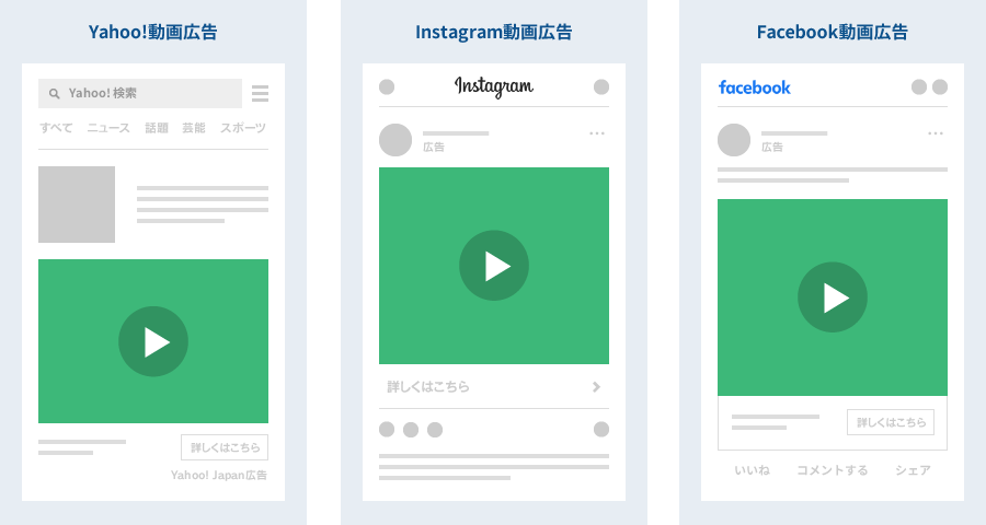 YouTube動画広告以外にも、運用型広告として配信できる媒体は多く存在しています。圧倒的なページビュー数を誇るYahoo!JAPANを初め、各SNS広告へも動画広告を配信することが可能です。